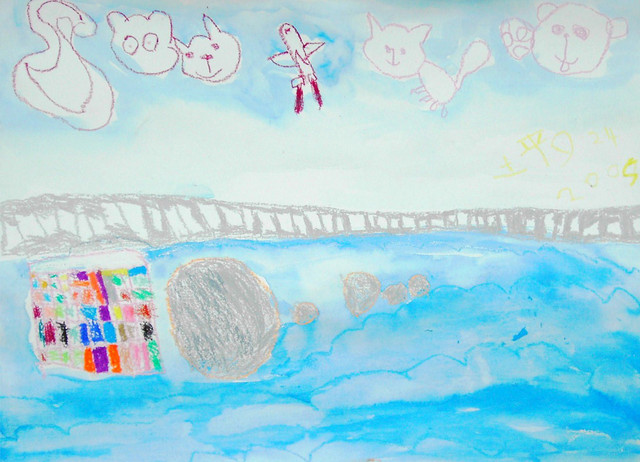 坪坪在創作上漸漸能夠獨立完成,並總能顯現她敏銳的觀察與成長, 很快的,我極少或完全不必給予指導。有一次創作主題是「橋」(圖二),在完成後的分享時間,坪坪以微弱不很清晰的語音說了:「天上的雲有的時候看起來很像貓或各式各樣的動物。」多麼細膩又富想像!那幅畫真令我印象深刻,每當仰望天邊雲朵,我總浮起坪坪素雅的畫上,那一列用筆輕盈的雲兒動物們。