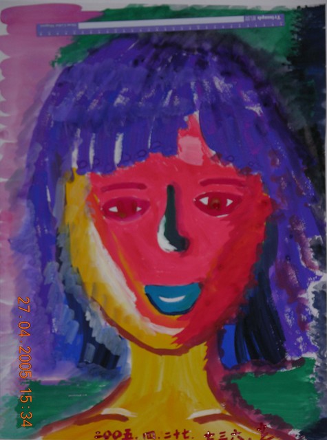 坪坪與我共創的第一張作品是「自畫像」(圖一),一開始我讓坪坪跟著我的食指行徑移動,或是由我握著她的手帶著她畫幾筆,讓她感受筆端繪出的色彩與運筆的變化。印象很深刻,在眾多彩色蠟筆中她選了白色當起筆。遲遲無法下筆的她,在我觀察一段時間之後,我問她:會不會畫圓圈圈?大圓加小圓來畫畫自己好不好?那時的她,用蠟筆畫完整一個人是非常吃力的,於是改用水彩筆和廣告顏料,它是不需太費力又可以快速見到驚喜與效果的好媒材。我們一起慢慢地讓畫面豐富與完整。這是坪坪與我共創的第一張作品,也是一張很耐看的作品:天邊的太陽,飛翔的小鳥與角落的綠樹,其中坪坪雙臂的肌肉,注意到了嗎?坪坪希望自己強壯。她非常在意畫面中央那幾筆非預期的“黑”,我的原則是不讓學生有“畫對或畫錯”的念頭,我會儘可能的用轉換或聯想消除憂心,當我說:「那黑黑的可能是路上的石頭,或是小小昆蟲。」她笑的接受了。面對畫畫,她也有著自己的想法與追求完美的心。