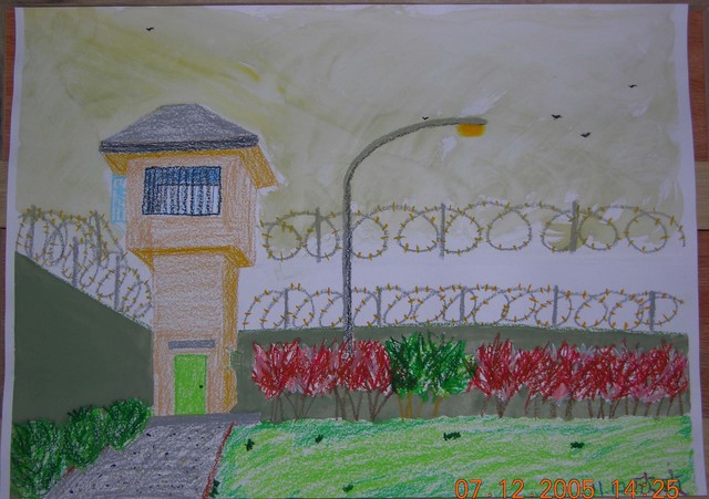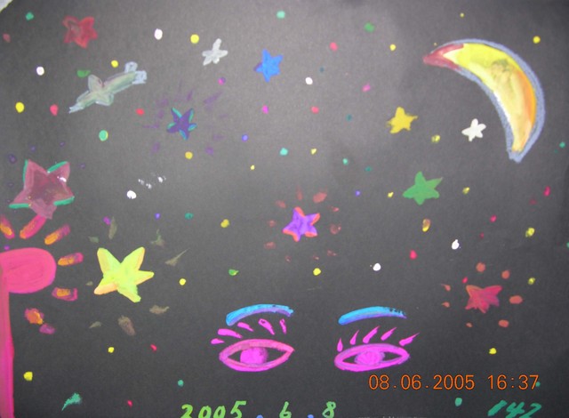 在心靈繪畫班2008年最後一期的第一堂課「難忘的一件事」作品中,我非常興奮的看見了坪坪有意識的構圖與個人風格的成熟表現。「兩個朋友」(圖三),畫兩位好朋友一起蹓狗。少有的側面描寫與前後的空間重疊,兩位好朋友牽著小狗朝著二個鞦韆行進,有動態有表情,遠處雲朵與黃色的襯景,讓人物的身形的輪廓曲線優美,神情輕鬆自若,迴盪在畫面中是一片祥和愉悅,是相當完整的傳達。